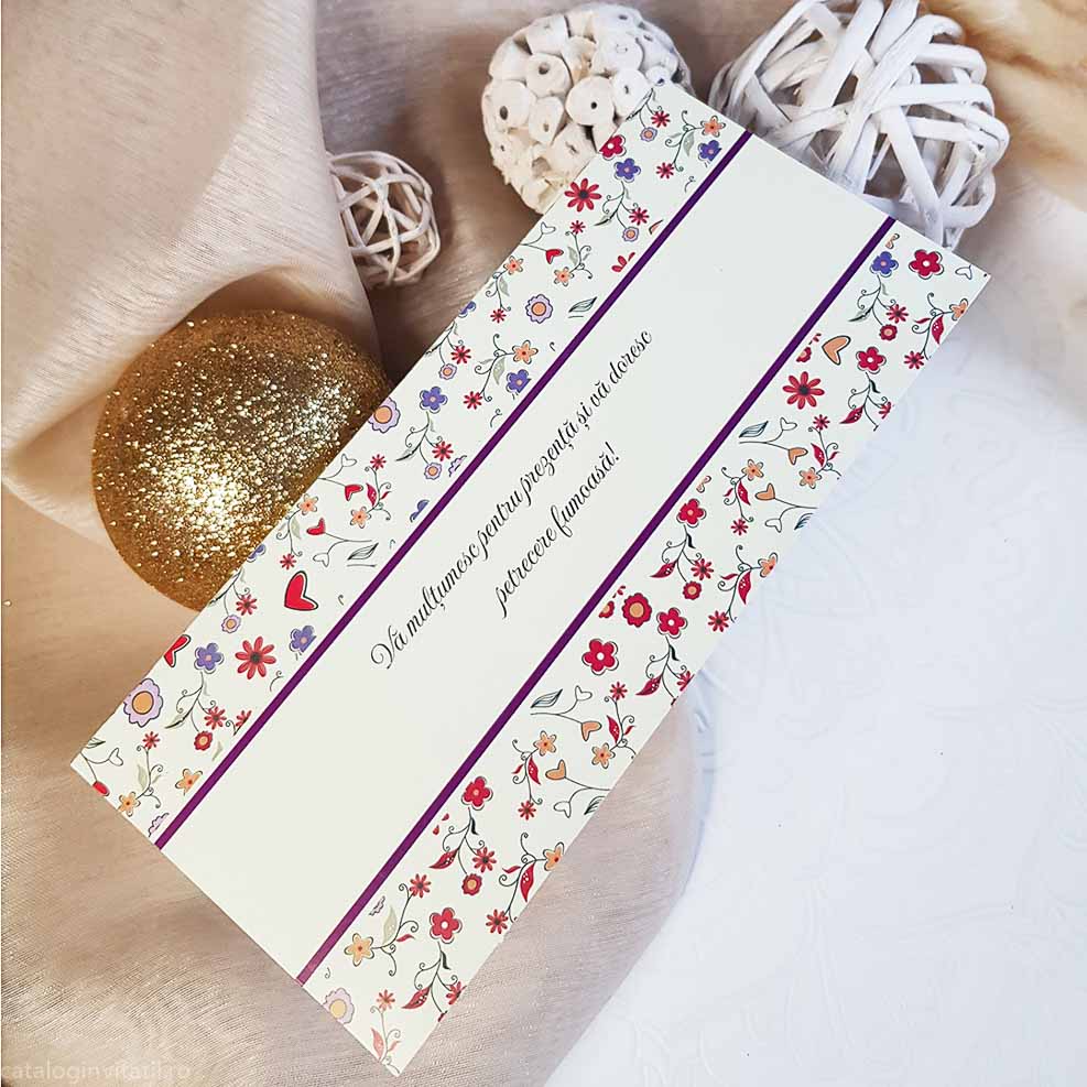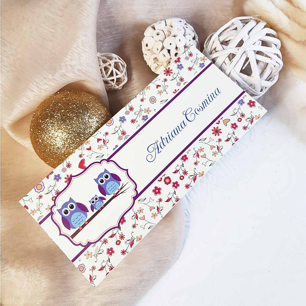 Plic bani bufnite 120  confecționat dintr-un carton  ce se impatureste in trei pe orizontala. La exterior este decorat cu trei bufnite pe un fundal multifloral langa este trecut prenumele copilului urmat de un mesaj scurt catre invitati. Plicul are dublu rol Plic bani si Place card.
