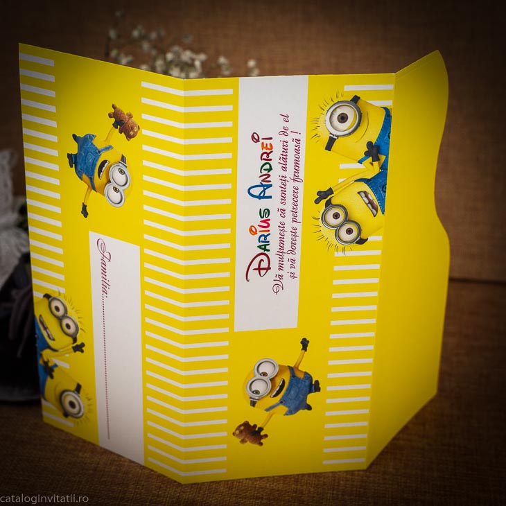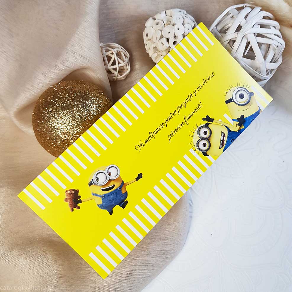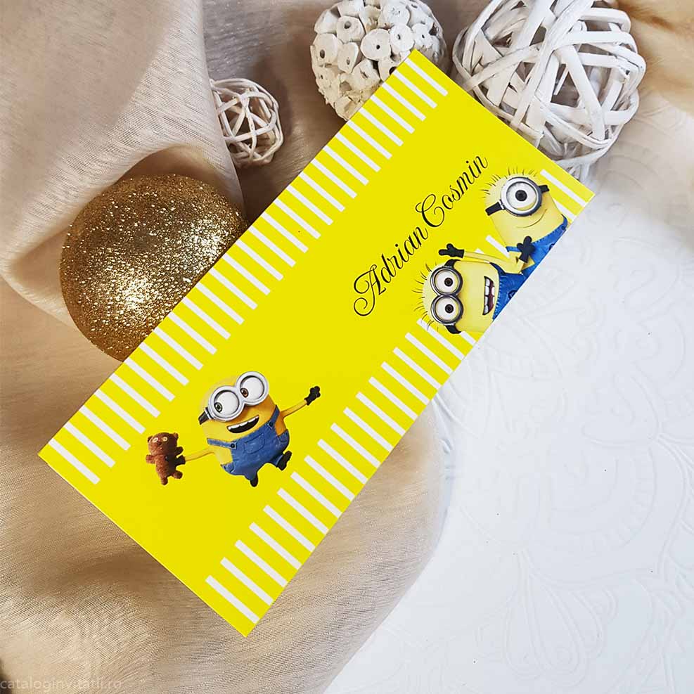 Plic bani Minioni 147 confecționat dintr-un carton ce se impatureste in trei pe orizontala. La exterior este decorat cu personajul Minion langa este trecut prenumele copilului urmat de un mesaj scurt catre invitati. Plicul are dublu rol Plic bani si Place card.