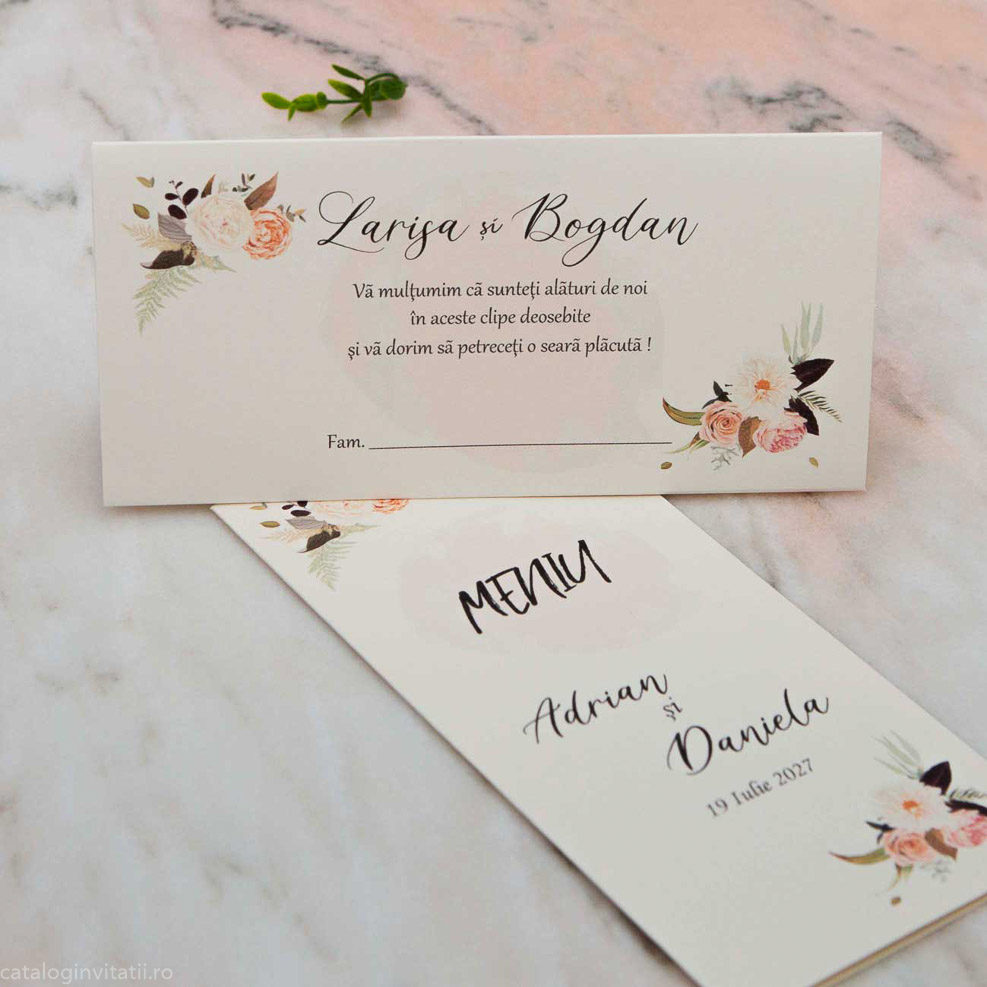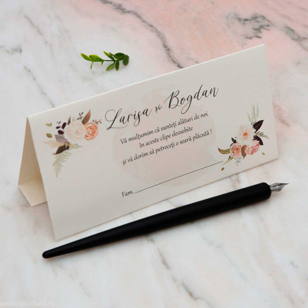 Decorat cu un model floral în nuanțe de portocaliu, acest plic aduce un aer vibrant și plin de culoare. Este important de menționat că acest produs are un rol specific: poate fi utilizat ca și place card, ajutându-te să organizezi așezarea invitaților într-un mod estetic și practic. La finalul evenimentului, plicul devine un suport elegant pentru cadoul oferit mirilor, adăugând un detaliu special și rafinat.