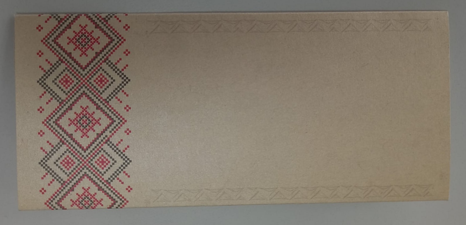 Plic bani ornament motiv arhaic romanesc dintr-un carton maron deschis ce imita hartia veche cu textura mata decorat cu elemente grafice ce reprezinta motive traditionale romanesti Suvoiul si Steaua in 8 colturi.