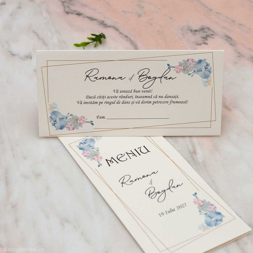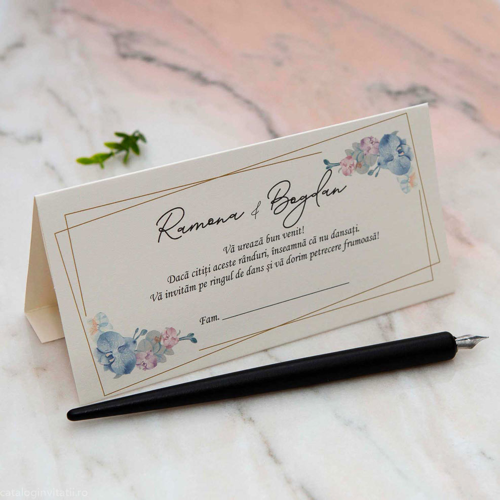 Decorat cu un model floral subtil în nuanțe de albastru, acest plic atrage privirile și adaugă o notă de eleganță. Este important de menționat ca are un rol specific: poate fi folosit ca și place card, ajutându-te să organizezi așezarea invitaților într-un mod estetic și practic. La finalul evenimentului, plicul devine un suport perfect pentru cadoul oferit mirilor, completând experiența cu un detaliu suplimentar de eleganță și rafinament.